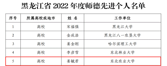 为弘扬我省教育系统广大教师立德树人精神,为全省教师选树学习榜样,进一步营造尊师重教的良好社会风尚,省教育厅近日印发《关于表彰2022年度全省师德先进集体和师德先进个人的决定》,全省共评选出师德先进集体60个,师德先进个人154人。我校农学院获得“2022年度全省师德先进集体”荣誉称号,食品学院姜毓君教授获得“2022年度全省师德先进个人”荣誉称号。