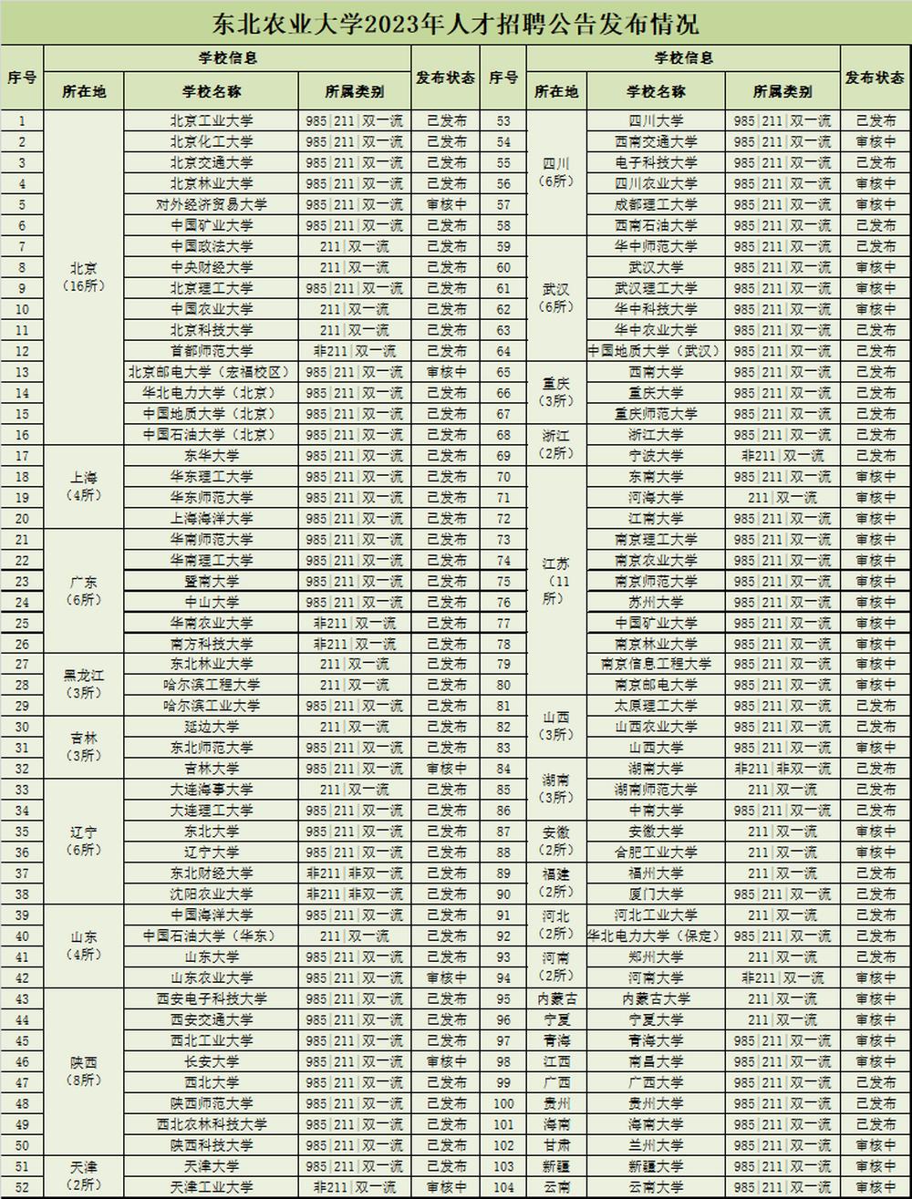 为扩大人才招聘宣传的覆盖面和影响力,学校在参加人才招聘双选会、深入高校开展专场宣讲会的同时,积极联系沟通多家招聘网站和媒体资源同步推送学校招聘公告,并面向“双一流”建设高校和部分重点高校毕业生就业信息平台发布招聘公告,目前已在70所高校发布东农招聘公告,另有34所高校正在进行信息审核。