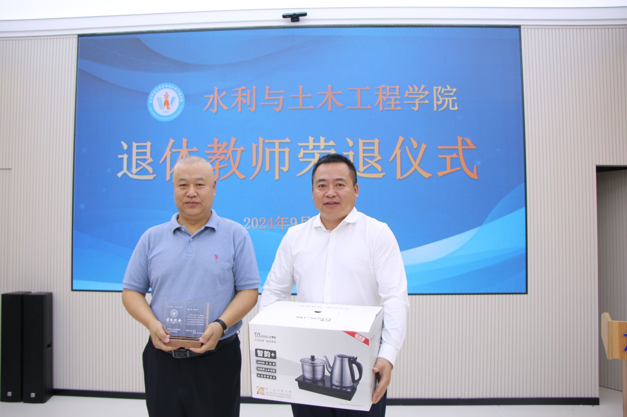 学院党委书记张索坤代表学院向三位退休教师表示最诚挚的感谢和最崇高的敬意。他表示,三位教师几十年如一日始终坚守岗位、履职尽责,为东农、为水利学院的事业发展倾注了大量心血,用实际行动展现了“东农水利人”的本色和风采,诠释了水利精神。同时,他代表学院向三位教师承诺:第一,学院将始终关心关注三位教师的退休生活,努力为大家提供更好的服务;第二,全院上下将继续发扬“艰苦奋斗、自强不息”的东农精神,以更加饱满的热情和更加昂扬的斗志投入到工作中去,不辜负大家的期望;第三,要把三位教师的宝贵经验和优良作风转化为学院发展建设的强大动力,一步一个台阶,推进学院向更高层次发展。