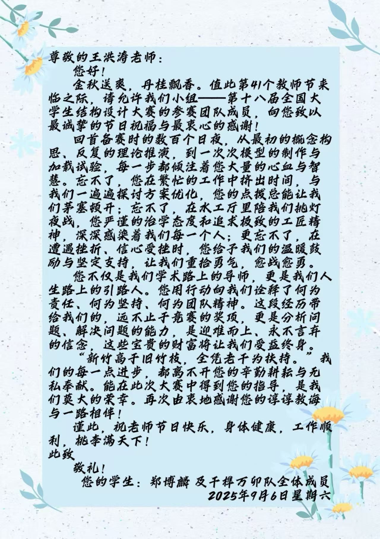 金秋送爽,桃李芬芳。在第41个教师节来临之际,为弘扬尊师重教的优良传统,表达对辛勤耕耘在教学、科研、管理一线教师的崇高敬意和诚挚感谢,水利与土木工程学院围绕“致敬、感恩、祝福”主题,策划开展多项暖心活动,营造出浓厚的尊师重教氛围。